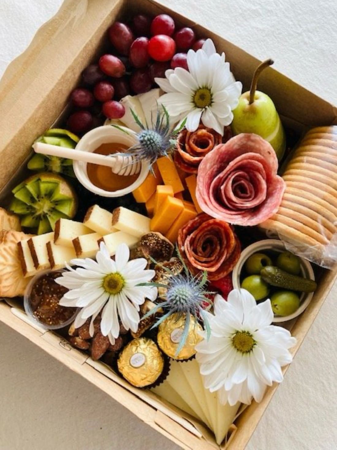 18”x12” wooden disposable board. Feeds up to 10 people. Platter contains 4-5 cheeses, 2-3 Italian meats, spreads/jams/honey and other additions including assorted fresh fruits, veggies, nuts and sweets. Bread/crackers are served on the side in a 10”x10” box to allow for more room on the platter for the good stuff!